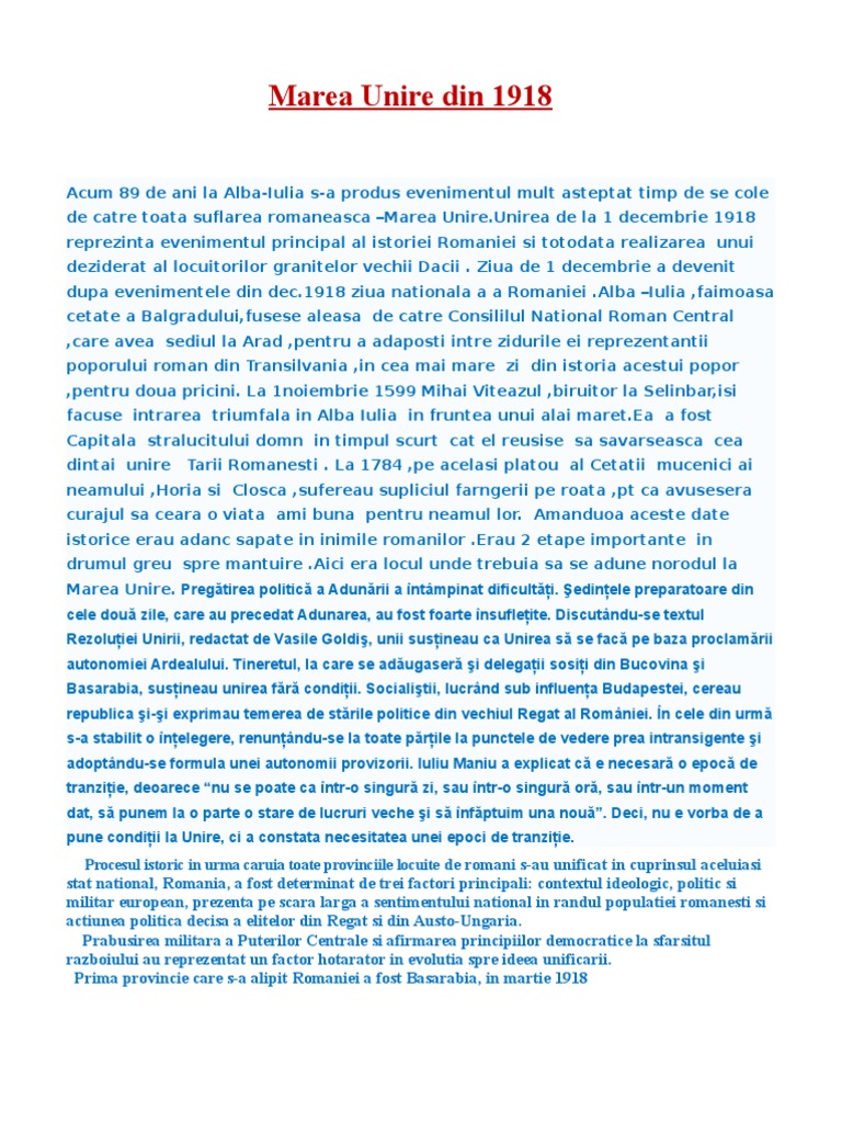 Marea unire din 1918 este un referat de nota 10. Referat, referate , referat romana, referat istorie, referat geografie, referat fizica, referat engleza, referat chimie, referat franceza, referat biologie. Sărbătoarea comemorează adunarea de la alba iulia și unirea provinciilor transilvania, banat, crișana, maramureș și sătmar cu regatul româniei. Regele ferdinand a aprobat unirea prin decretul din 22 aprilie 1918. Recent papers in marea unire de la 1918.
