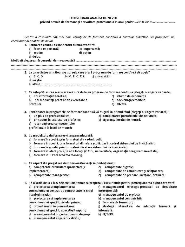 Din acest motiv vă rog foarte mult să ne ajutaţi în identificarea celor mai realiste direcţii de. Sunteti multumita de baza materiala scolii in cadrul careia va desfasurati activitatea? Alegeți din peste 100 de exemple de chestionare.